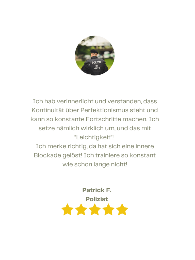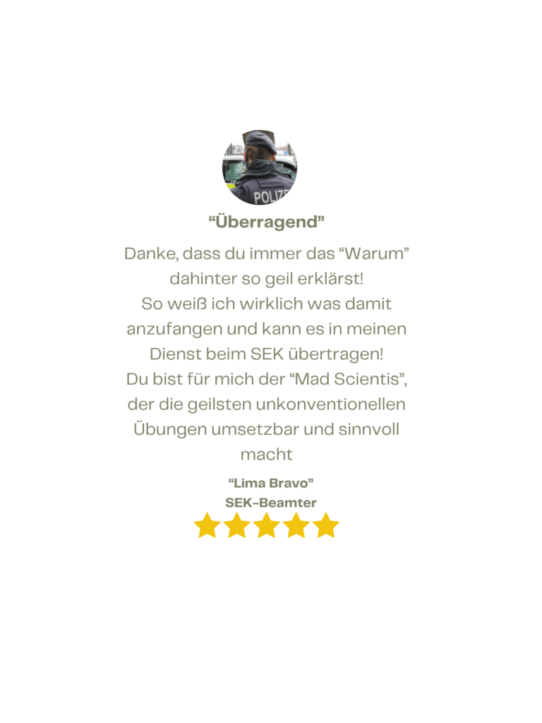 Mein Fokus liegt nicht auf kurzfristigem „Abfuck“, sondern auf nachhaltiger Stärke: Kopf und Körper sind dein primäres Waffensysmte! Sie müssen als Einheit funktionieren, damit du im Dienst abliefern kannst, ohne dich privat zu zerstören.